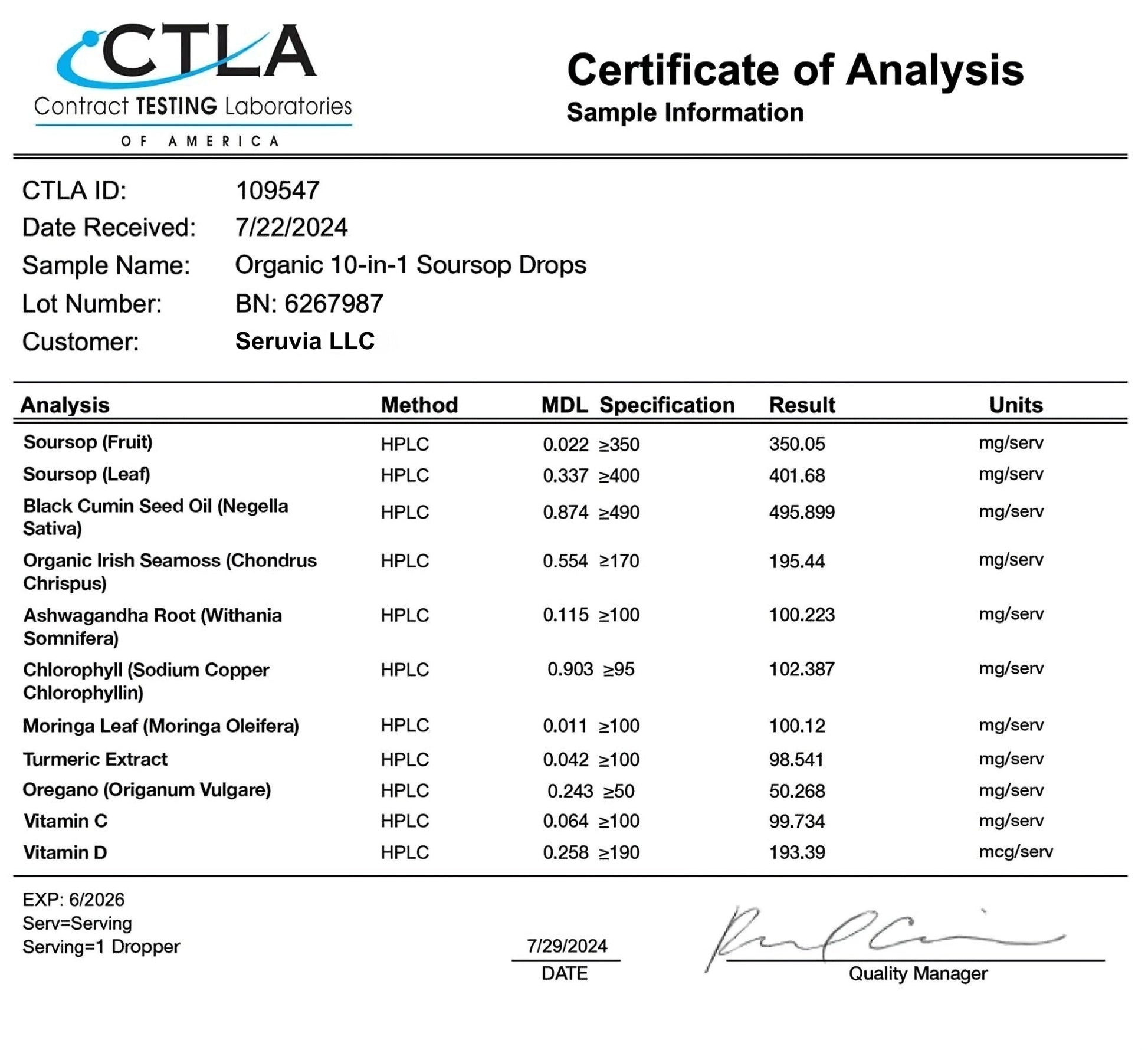 Many supplements require taking multiple pills throughout the day, which can feel overwhelming. Our 10-in-1 formula is designed as a simple, convenient alternative — bringing together 10 carefully selected herbs and nutrients, including soursop, sea moss, and ashwagandha, in one easy-to-use liquid format.
